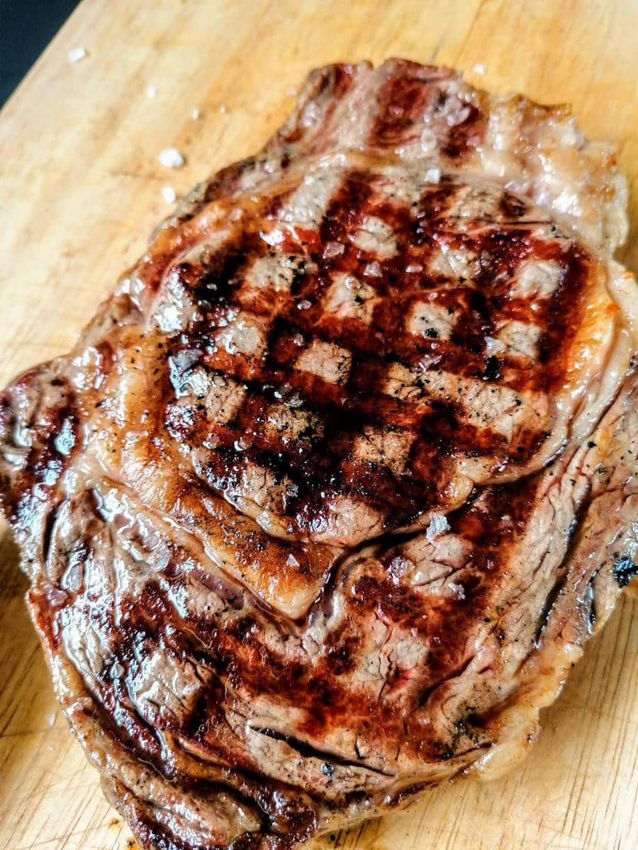 - Ribeye (costata o entrecôte): questa è la regina della marezzatura. Ricavata dalla parte centrale delle costole, ha un nucleo di grasso (l'”occhio”, o eye) che, sciogliendosi, la irrora di sapore. È considerata da molti la bistecca più saporita e pregiata in assoluto.