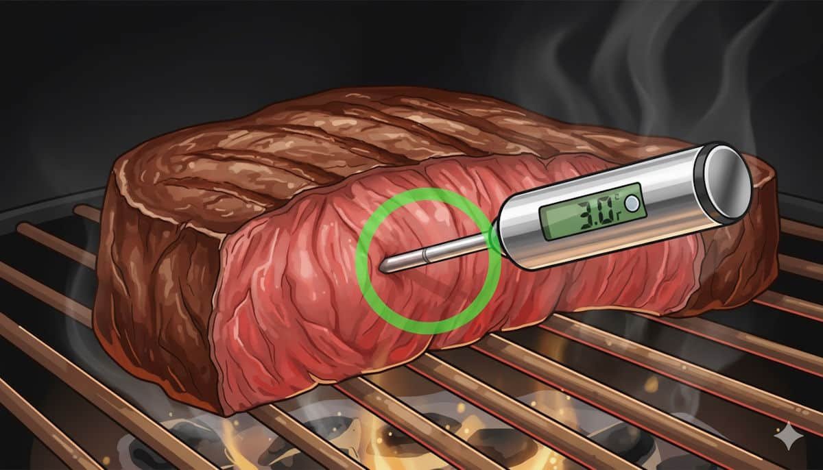 Inserisci la sonda dal lato, puntando al cuore della parte più spessa del controfiletto, lontano dall’osso. Se tocchi l’osso leggerai più caldo del reale. Se la bistecca è molto spessa (sopra i 5 cm), fai 2 misurazioni: una vicino al centro e una verso il bordo più spesso. La lettura “vera” da considerare è sempre la più bassa tra le due.