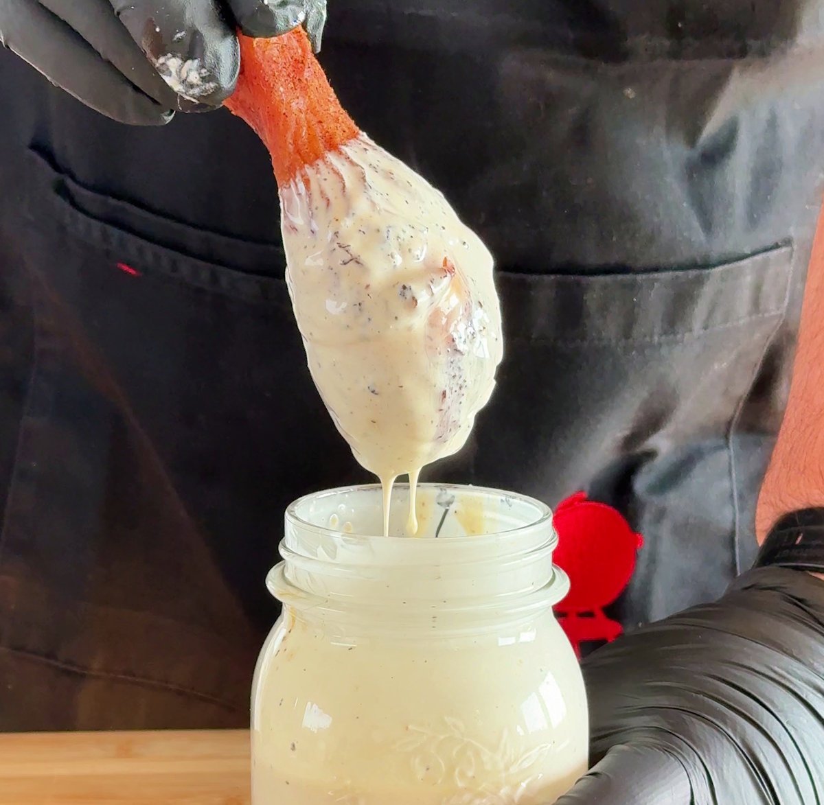 Finitura (The Dunk): togli i fusi dalla griglia e, mentre sono ancora bollenti, immergili nella Alabama White Sauce (o spennellali abbondantemente).