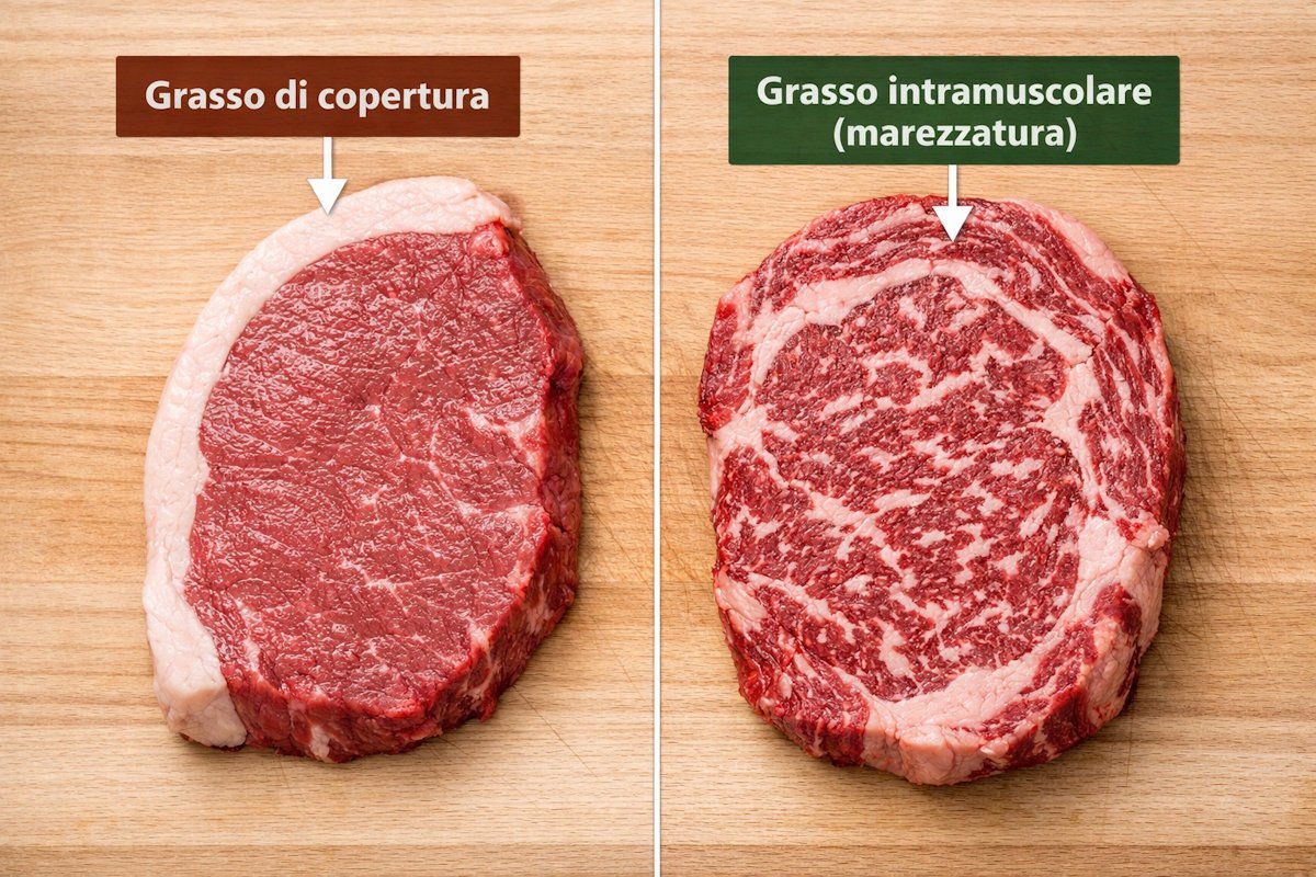 Per capire il valore della marezzatura, dobbiamo fare una distinzione anatomica fondamentale. Non tutto il grasso del bovino è uguale. Sulla tua bistecca puoi trovare due tipi di grasso: