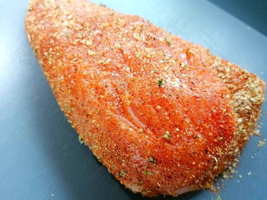 - Ungi leggermente il petto di tacchino su tutti i lati con l’olio evo quindi spolvera abbondantemente con il rub appena preparato.