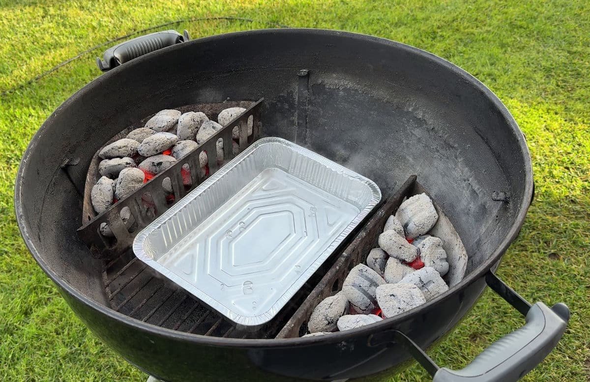 - Accendi mezzo cesto di bricchetti e prepara il barbecue per una cottura indiretta a circa 160°C – 170°C. Usa due cestelli porta carbone posizionati ai lati opposti. Al centro, posiziona una leccarda di alluminio con due dita d'acqua per raccogliere i grassi.
