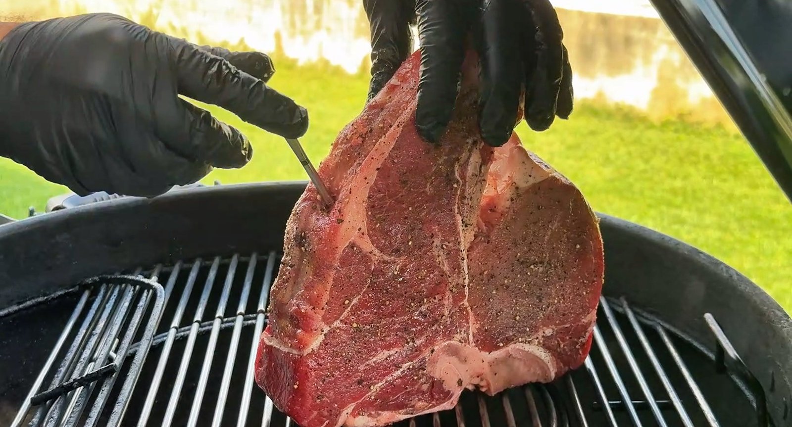 Asciuga la bistecca con carta da cucina. Inserisci la sonda del termometro orizzontalmente, al cuore della carne. Posizionala sulla griglia nella zona indiretta, lontano dalle braci. Se vuoi, aggiungi un chunk di legno aromatico sulle braci. Chiudi il coperchio.