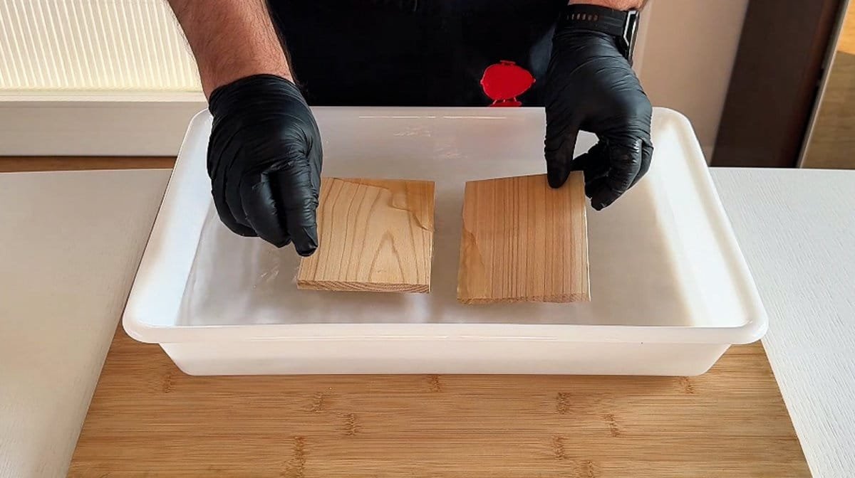 Ammollo (fondamentale): immergi la placca di cedro in acqua fredda per almeno 60 minuti. Usa un peso (come una pentola o una bottiglia) per tenerla completamente sommersa.