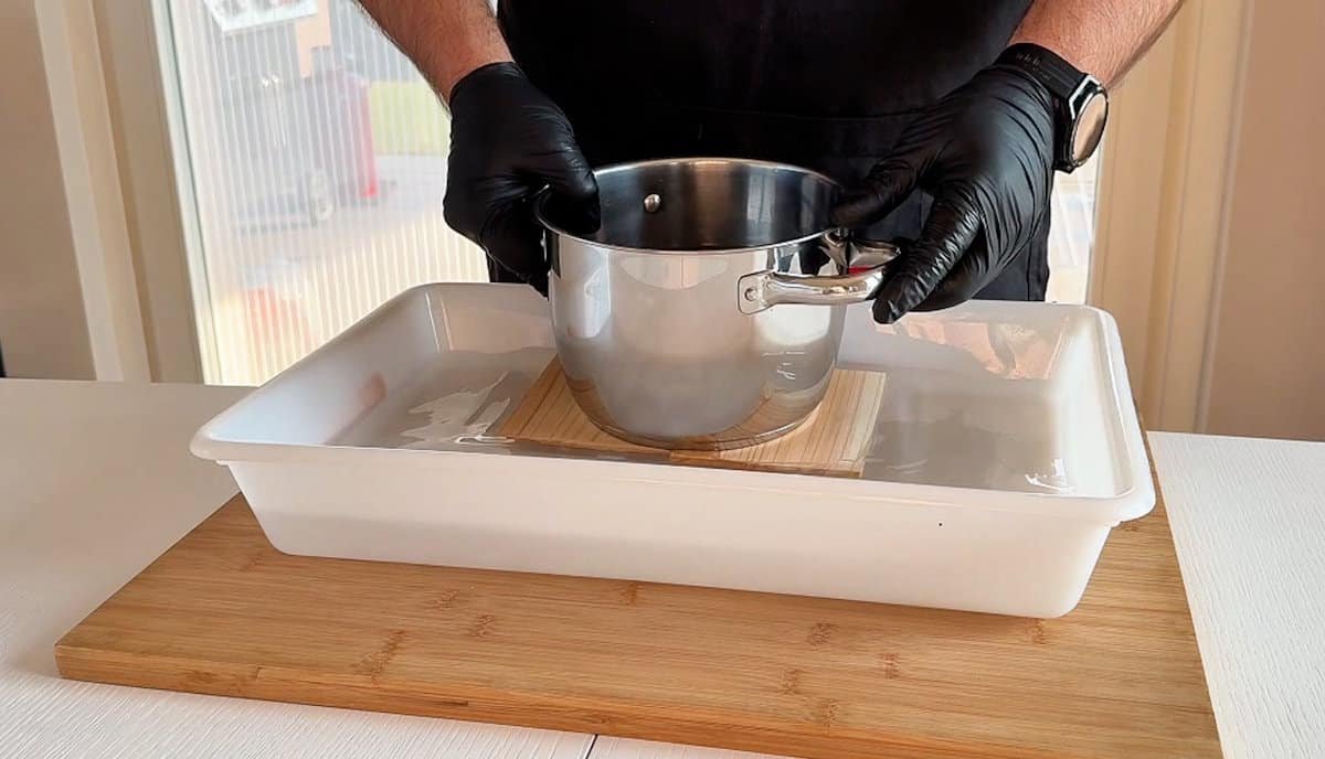 Il legno galleggia, è fisica. Per tenerlo sommerso e farlo idratare bene, metti la placca in una teglia con l’acqua e piazzaci sopra un peso (una pentola piena o una bottiglia). In questo modo il cedro assorbirà umidità uniformemente.